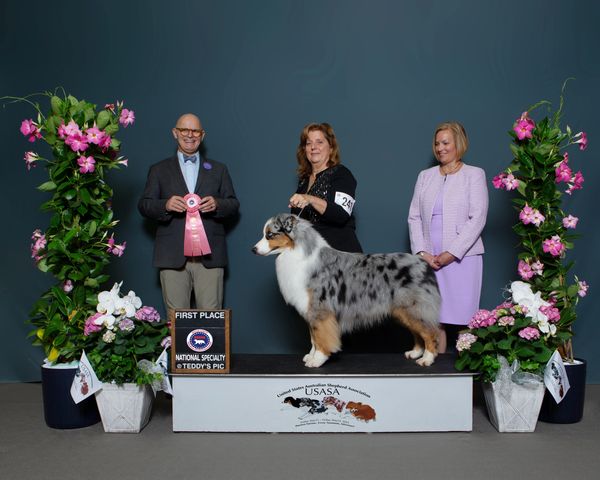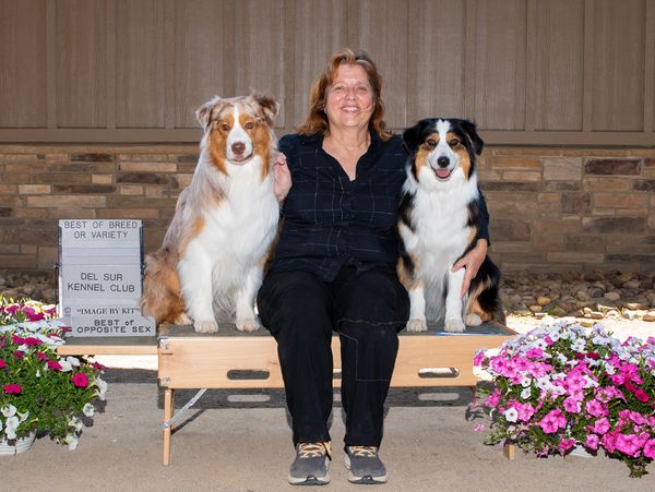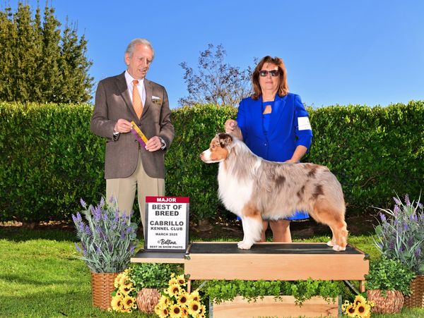 AKC GCHB/ASCA CH Chasing Dreams is pursuing his GCHS and RTCH titles this year. He earned his AKC Bronze title at Del Sur after going BOB twice at Cabrillo and BOB three times at Chaparrel KC. GCH Chase is AKC Top 20 Aussie Dog OHS. Chase finished his AKC GCH in January '24 and won multiple Group Placements including Mission Circuit and Mesilla KC. Chase finished young with ASCA CH in Sept '23 followed by AKC CH in Oct '23. He also holds GCHB, CH, RNX, RN, RAX, CD and DNA-CP titles.