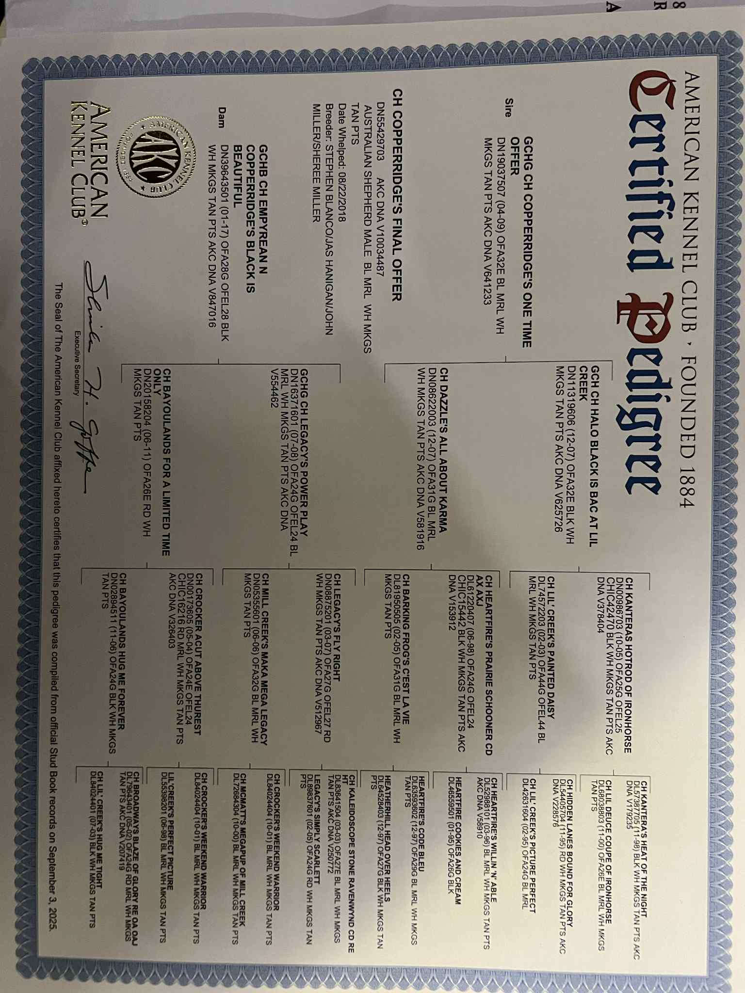 Chance is an AKC champion with wonderful movement. His father is GCHS/HOF Copperridge One Time Offer. He earned early success in the conformation ring and matured nicely. He's a proven stud with CH and GCH gets.